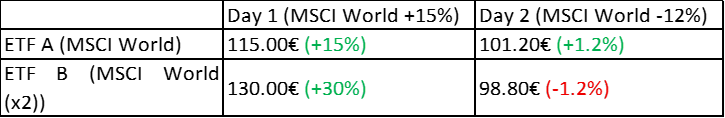 Let’s take an investor who, at market open, places €100 into ETF A (replicating the MSCI World) and €100 into ETF B (a 2x leveraged MSCI World ETF). The MSCI World rises +15% on day one and falls -12% on day two: